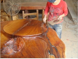 大板(柚木、花梨木、雞翅木、檀木等)在修補前,首先應將大板里的水分風干,好把木材內(nèi)的含水量控制在6%-12%之內(nèi),并且要將有縫隙和裂紋處的泥沙木屑清理干凈再進行灌膠或涂膠修補,如果裂縫處底部是相通的,則需要將底部先堵住,待補完膠再打磨掉。這樣修補出來的成品才相當平整和美觀.
