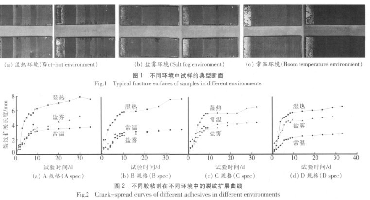 依次為 D>A>B>C; 常溫環(huán)境中,種規(guī)格膠粘劑的裂紋擴展由快到慢依次為 C>A>B>D 鹽霧環(huán)境中,種規(guī)格膠粘劑的裂紋擴展由快到慢依次為 D>A>C>B。